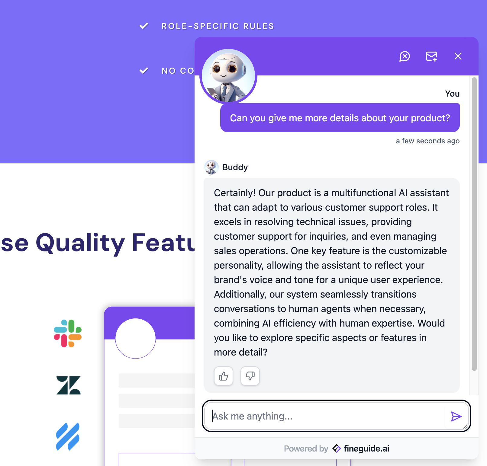 This is not only a powerful Support Assistant it can also perform actions on behalf of users, provide information in a suite of different widgets and integrate with a variety of 3rd party tools for. We aim to provide the most accurate conversational engine with low hallucination rate and fast responsiveness.