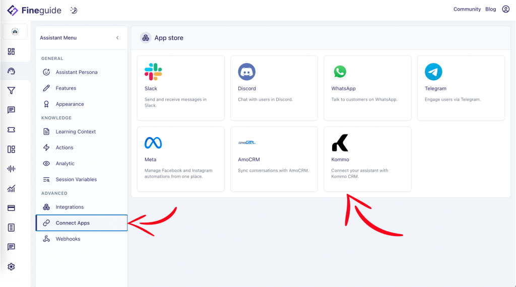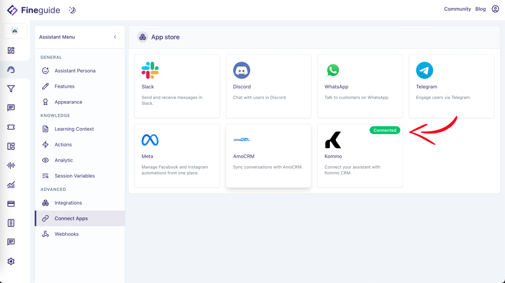 Integrating Kommo with your Fineguide assistant allows you to sync conversations, automate CRM updates, and enhance your customer interaction workflows. Follow this step-by-step guide to connect, verify, and configure the integration.